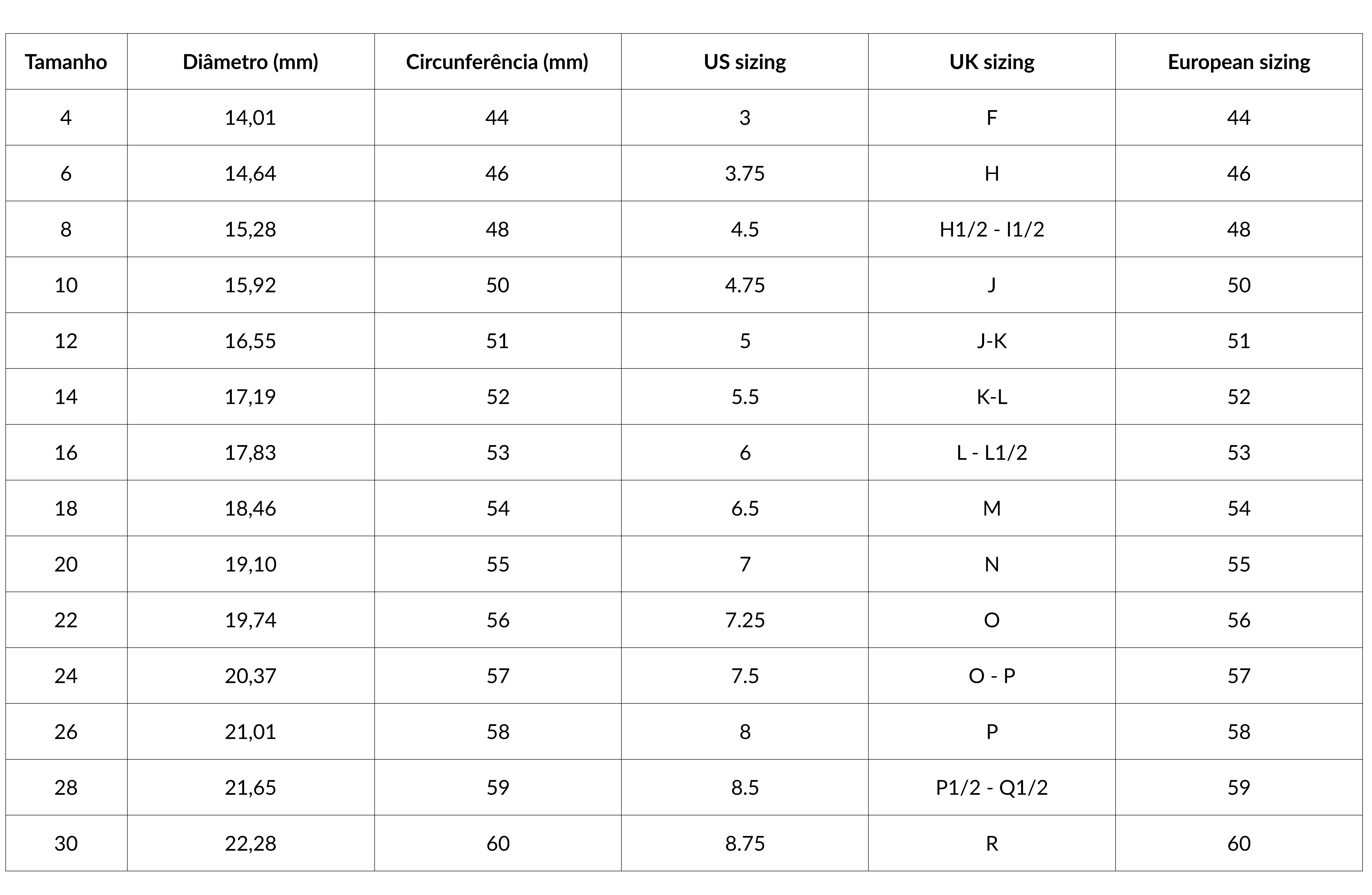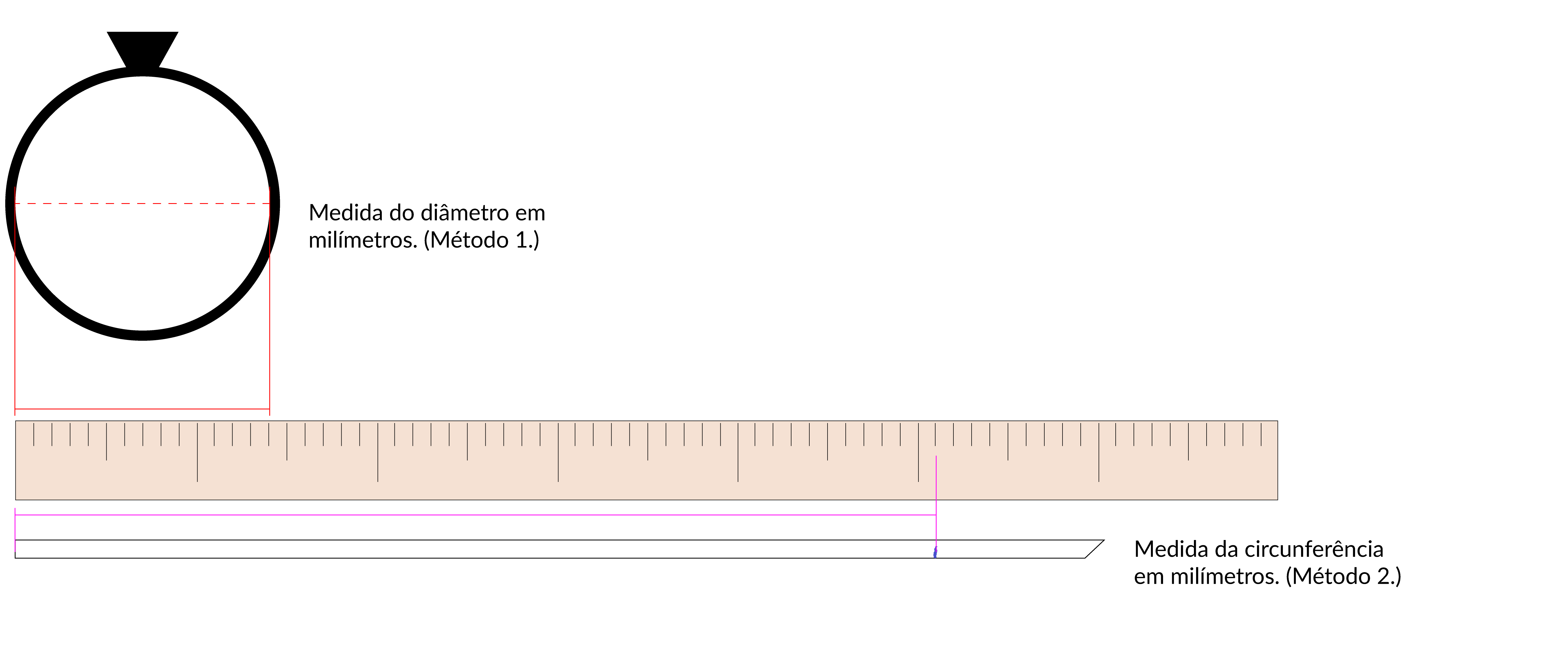 Método 2: Enrole o seu dedo com uma tira de papel, uma fita ou uma linha e marque a medida da circunferência. Com uma fita métrica ou régua confira a medida, e veja na tabela abaixo a conversão da circunferência para o tamanho de anel.